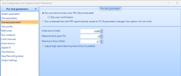 Before testing begins it is important to run a check to build a new FRF, or use previous FRF, based on a low input drive. The test will also check to make sure that the test drive will not exceed shaker parameters. Pretest drive and response level of ultimate testing excitation are adjustable to user preference.