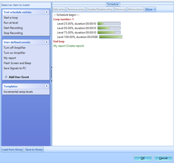 Event actions panel allows the user to define testing run schedule events. This can be used to run test procedures such as increase or decrease level, next entry, pause test and other similar actions. Events can also automate analysis process by generating reports, screen capture, and sending emails. User events are a powerful and diverse tool but are not required for testing purposes and are used only when needed for automation to meet testing requirements set by user.