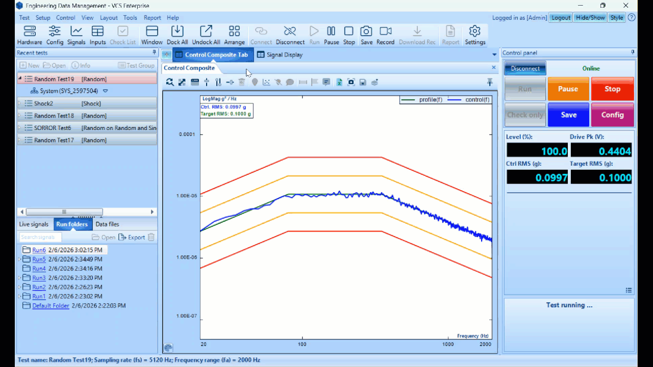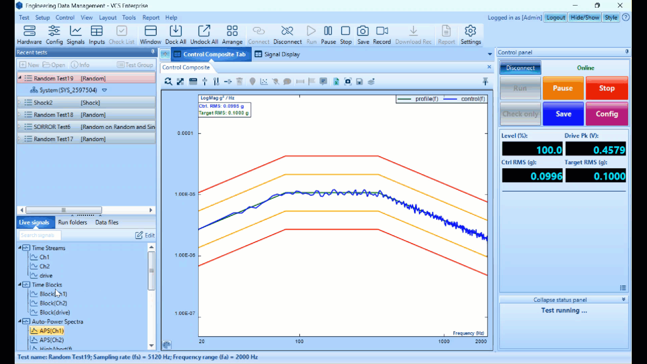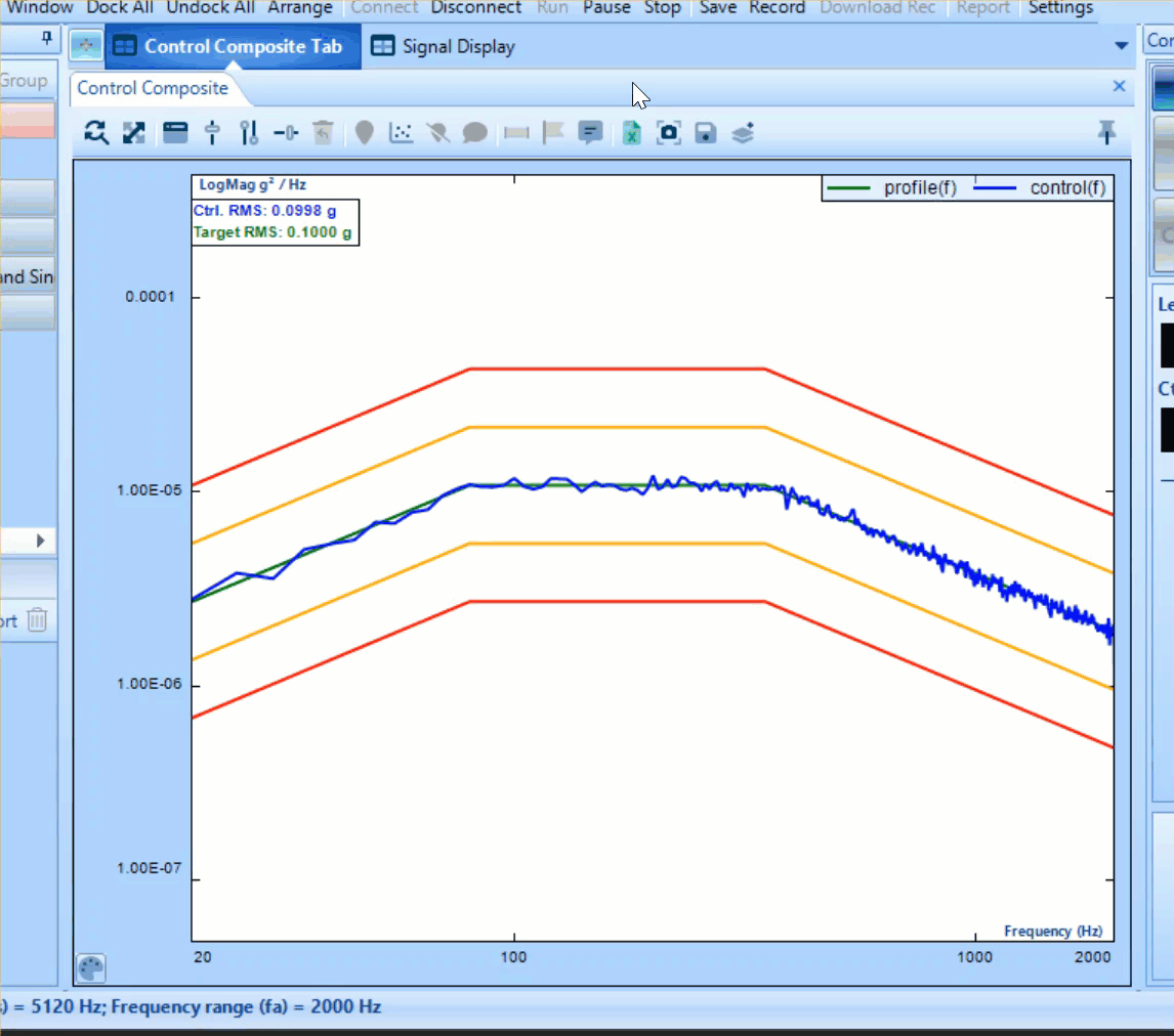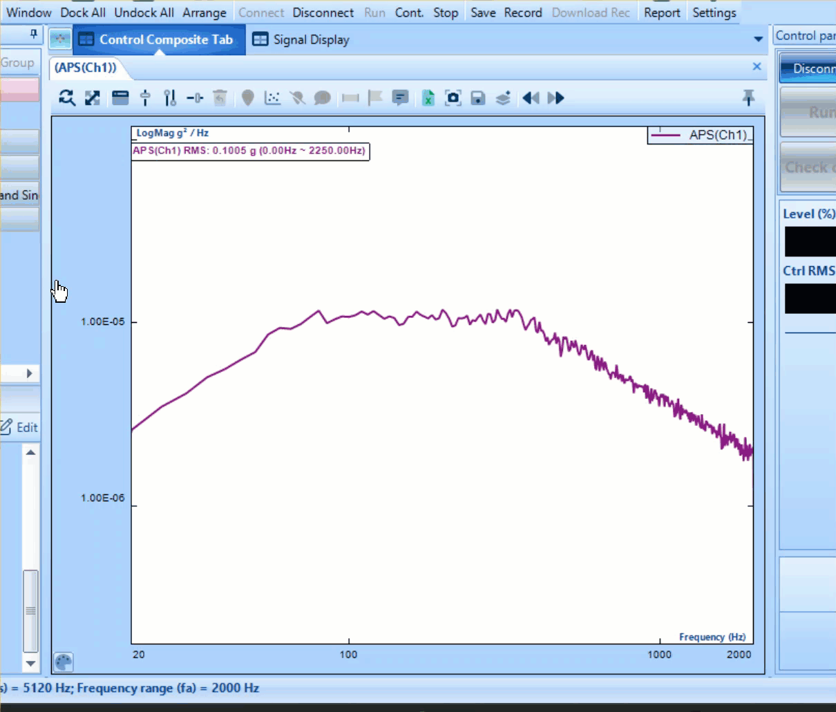 Display window is used to show both time stream data and frequency domain data. Windows can be configured to meet requirements of user for general ease of use or for aesthetic purposes. The display window has capabilities to process data and show complex results such as meeting vibration criterion and damping ratios. Typically, the display window is also where user analysis occurs within EDM software.