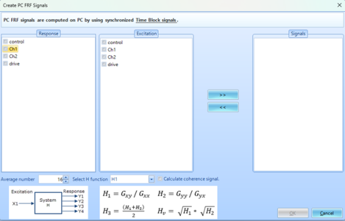 PC FRF signals give user options to create transfer functions for desired input (response) and output (excitation) channels. Also allows for customization of FRF and coherence calculations.